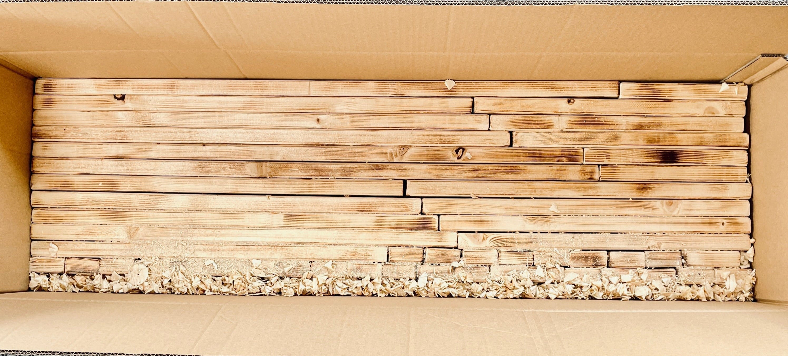 Für die Verpackung verwenden wir überwiegend plastikfreie Materialien und zum Schutz der Produkte Holzspäne, die im Produktionsprozess entstehen.